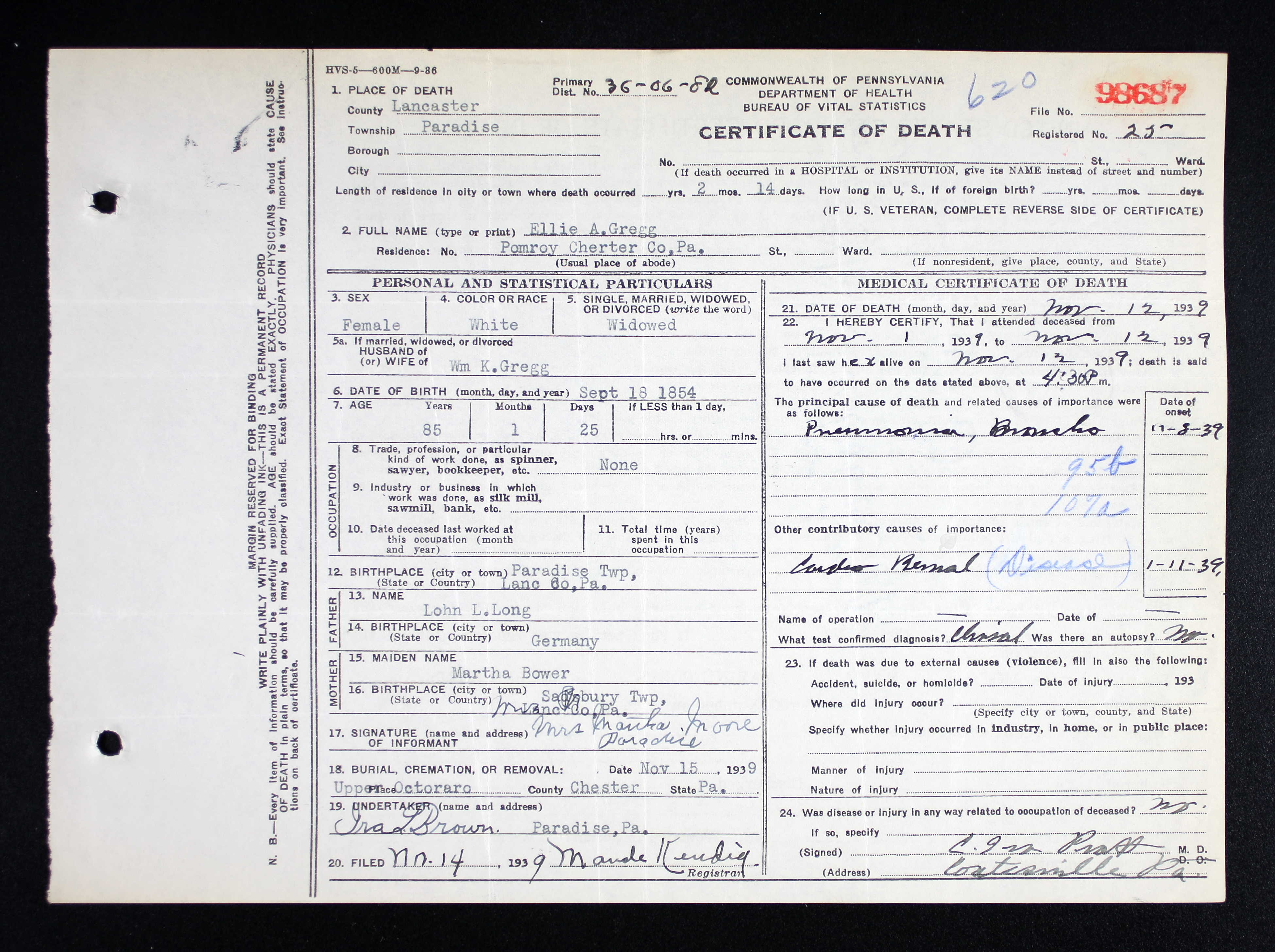 ? As of 1860, Ella J Bower was also known as Ellen Long.3 Her married name was Gregg. She and William K Gregg appeared on the census of 9 June 1880 at Paradise Township, Lancaster, Pennsylvania; Another son appears to have been recorded, then erased, possibly deceased.4 Ella J Gregg was listed as a resident in William K Gregg and Ella J Gregg's household in the census report on 12 January 1920 at Pomeroy, Chester, Pennsylvania.5 She witnessed the death of William K Gregg on 7 September 1926 at home of his son, Willis 85 Chester Ave, Coatesville, Chester, Pennsylvania; Cause of death was Chronic Nephritis.6,7 Ella J Bower Lived at Pomeroy, Chester Co before 1939. She Obit listed two sons;Willis,Coatesville & J Bower, CA. in 1939.