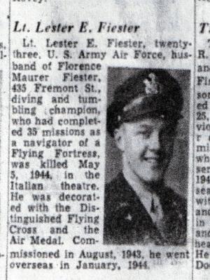 Lester Elwood Feister was born on 28 May 1920.1,2 He married Florence Mauer after 1930.3 Lester Elwood Feister died on 5 May 1944 at age 23.2,4 He was buried on 10 May 1944 at Sicily-Rome American Military Cemtnery, Nettuno, Italy; Second Lieutenant, U.S. Army Air Forces
