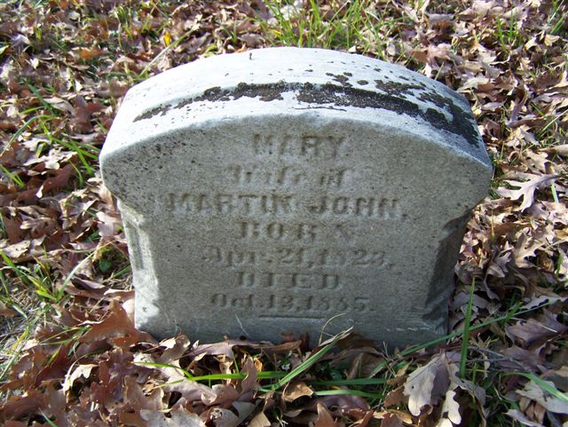 Mary Whitaker was born on 21 April 1823 at Pennsylvania.2,3 She married Martin John.1 Mary Whitaker died on 13 October 1885 at age 62.3 She was buried on 16 October 1885 at Slate Hill Cemetery, Dayton, Armstrong, Pennsylvania.3 Mary Whitaker Find-a-Grave.com ID # 31586559.