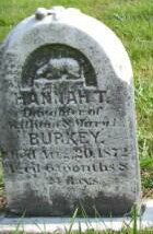 Hannah Burkey was born circa 1872.1 She died on 20 August 1872. Interesting fact, Hannah was listed on 1880 census with her family as age 8.2 She was buried on 23 August 1872 at Rancks United Methodist Church Cemetery, New Holland, Lancaster, Pennsylvania.2 Hannah Burkey Find-a-Grave.com ID # 30185410.