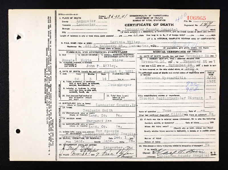 Lavinia Smith was born on 2 August 1851 at Lancaster, Pennsylvania.1,4 She married John P. Milley, son of Edward P Milley and Julia Ann Milton, circa 1884; 1910 census states he was married 4 times.1 Lavinia Smith died on 28 November 1937 at Lancaster County Hospital, Lancaster Township, Lancaster, Pennsylvania, at age 86. Cause of death was chronic Myocarditis & chronic Cardiovascular Disease.4 She was buried on 1 December 1937 at Greenwood Mausoleum, Lancaster, Lancaster, Pennsylvania.4