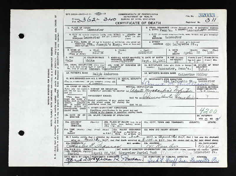 Milton E. Anderson was born on 16 September 1901 at Lancaster, Lancaster, Pennsylvania.1,3 He married Anna B. Hufford, daughter of Samuel Hufford and Ida Rupp, on 27 November 1924 at Lancaster, Pennsylvania.4 Milton E. Anderson died on 22 April 1954 at St Joseph's Hospital, Lancaster, Lancaster, Pennsylvania, at age 52. He died while working as a cement contractor at Prince and Conestoga streets in Lancaster. Taken to hospital by his son Russell, also working same location. Cause of death was Acute Mycardial Infraction.4,5,3 He was buried on 26 April 1954 at Riverview Burial Park, Lancaster, Lancaster, Virginia.3
