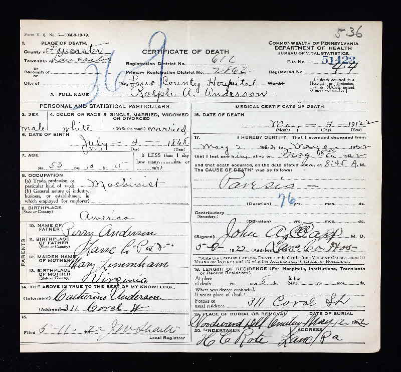 - [S32] Death Certificate, Pennsylvania Dept heath Death Certif # 51428 for son Ralph Anderson.