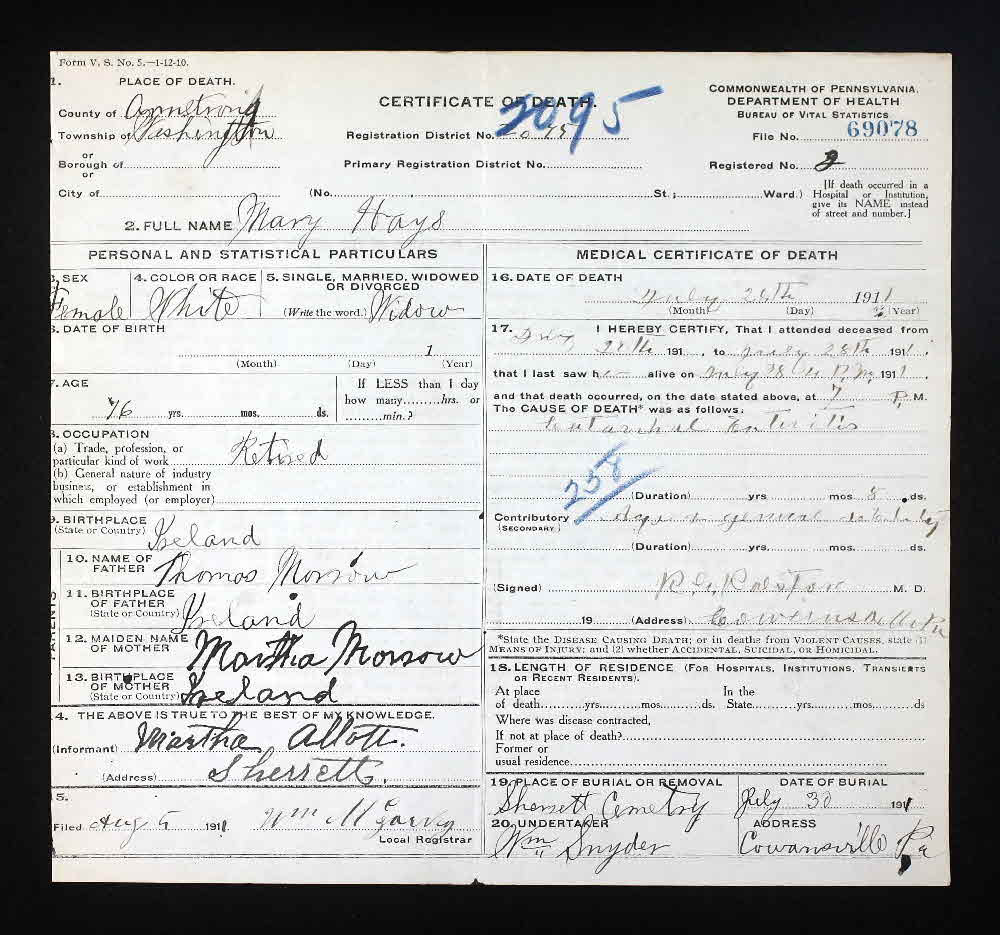 Mary Hays was born on 30 June 1849 at Northern Ireland.1,2,3,4 She married William Stewart, son of William Stewart and Margaret Densmore, circa 1873.5 Mary Hays died on 28 May 1943 at Madison Twp-her residence, Kittanning, Armstrong, Pennsylvania, at age 93. Cause of death was coronary sclerosis, duration of 2 years.1,4 She was buried on 30 May 1943 at St Mary's Episcopal Cemetery, Madison Twp, Red Bank, Armstrong, Pennsylvania, in row 7.6,4 Mary Hays Find-a-Grave.com ID # 44591900.7