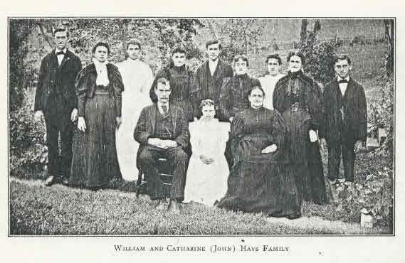 William Hays b. 10-7-1838 d. 2-8-1908, son of Wm. J. Hays Jr. and Letitia Morrow, married on 12/29/1864 in Rimersburg, PA Catherine Ann John b. 3-5-1843 d.4-29-1916, daughter of Martin John III and Mary Whitaker, granddaughter of Peter John and great granddaughter of Martin John. William came to this country from Ireland with his parents and his fathers two brothers, Robert Hay(es) and Fred Hay(s) in about 1854. The family located on a farm in Madison Twp., Armstrong County, PA., where his father followed agricultural pursuits and ran a distillery. Soon after William married Catherine, he settled in Washington Twp. on a tract of 120 acres, which he cultivated and also ran a saw mill. He was a veteran in the Civil War, serving 3 years as a member of Company E in the 62 Regiment Pennsylvania Volunteer Infantry from Clarion Co. There is an account of his war experiences written by Carolyn Raham,