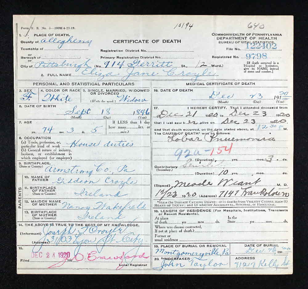 - [S32] Death Certificate, Pennsylvania Death Certificates 1906-1963. Certificate # 69078.