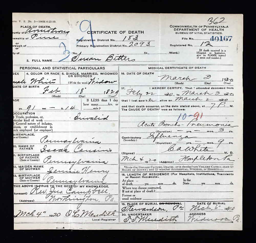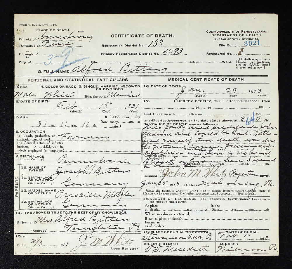 - [S32] Death Certificate, Pennsylvania Death Certificates 1906-1967 for Alfred Bitters # 3921.