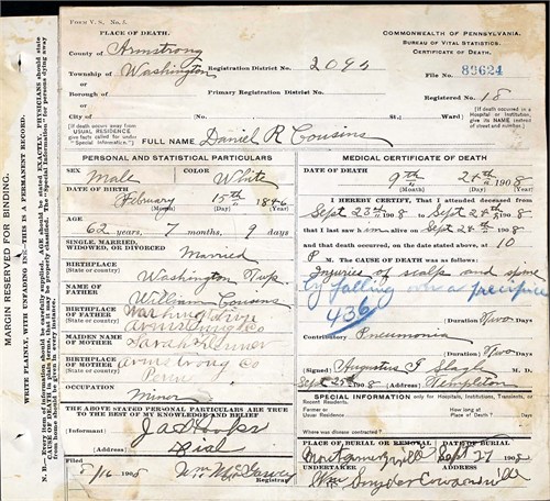 Daniel R. Cousins was born on 15 February 1846 at Washington, Armstrong, Pennsylvania.1,3 He married Martha Woodrow, daughter of James Allen Woodrow and Frances Lewis, in January 1870.4 Daniel R. Cousins died on 24 September 1908 at Armstrong Township, Armstrong, Pennsylvania, at age 62. Cause of death was injuries to scalp and spine from fall over a precipice and after two days contracted pneumonia.5 He was buried on 27 September 1908 at Montgomeryville Baptist Church Cemetery, Adrian, Armstrong, Pennsylvania.2 Daniel R. Cousins Find-a-Grave.com ID # 107523774, no gravestone.