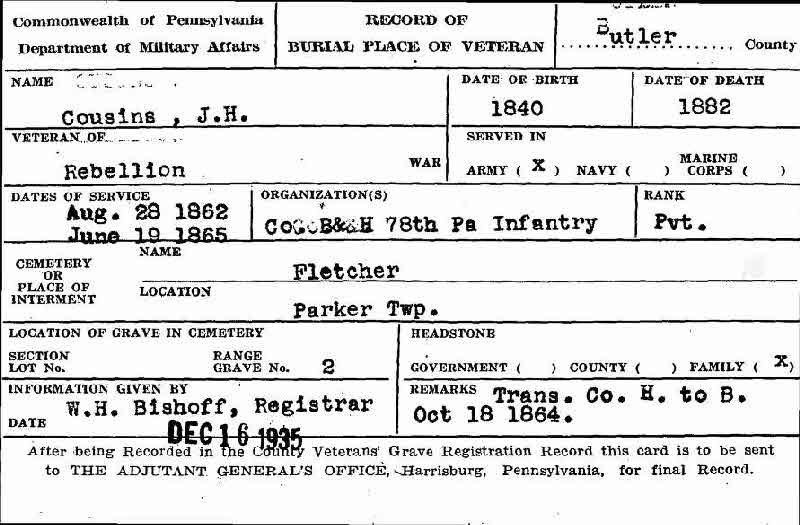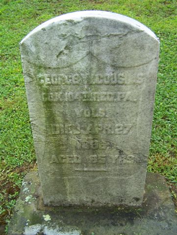 ? He began military service on 6 March 1865 at Kittanning, Armstrong, Pennsylvania, 104th Regiment, this card states he deserted 8-1-1865 at Norfolk, VA.4 He was described as being 35 years old, having a Fair complexion, was 5'8' tall, blue eyes, Hair, Light, Occupation: Laborer. Born in Armstion Co, Resided in Armstrong Co. on 6 March 1865 at Kittanning, Armstrong, Pennsylvania.5 He and Jane Cousins appeared on the census of 1 June 1880 at Watersonville, Armstrong, Pennsylvania. Also living in household was a servant, Mary Elder, age 20. George served as census enumerator for Washington Township this census.6 George W. Cousins appeared on the census of 1890 at United States Census of US Veterans and Widows of the Civil War, Washington Township, Armstrong, Pennsylvania,Information given: Private, Company K, Regiment 101, Pennsylvania, Volunteers, Served Feb 1865 to Sep 20 1865, 7 months. Injury reported was injured back.7