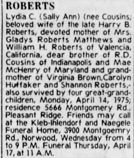? She was listed as a resident in John A Cousins and Eliza Jane Cousins's household in the census report on 1 June 1900 at Pine Twp., Armstrong, Pennsylvania; Also listed on this census is Etta Cousins, age 3 birthday Oct 1897, grand daughter (of John.)1 As of circa 1910,her married name was Roberts.2,3 Lydia Cousins appeared on the census of 4 May 1910 at Madison, Armstrong, Pennsylvania.7 She and Harry Bechler Roberts appeared on the census of 14 January 1920 at 322 W Fourth St, Cincinnati, Hamilton, Ohio.8 Lydia Roberts and Harry Bechler Roberts appeared on the census of 11 April 1930 at 322 W Fourth St, Cincinnati, Hamilton, Ohio.3 Lydia Cousins was named an heir in the will of Eliza Jane Longstreth dated 13 August 1930 at Dee, Armstrong, Pennsylvania.9 Lydia Roberts and Harry Bechler Roberts appeared on the census of 27 April 1940 at 2311 Kemper Lane, Cincinnati, Hamilton, Ohio. Also living with household was Marie Polley, b 1911, a lodger.10 Lydia Cousins lived on 30 May 1959 at Cincinnati, Ohio.11 She lived on 25 January 1962 at Cincinnati, Ohio.12 As of before 1975, Lydia Cousins was also known as Sally Ann Roberts.5