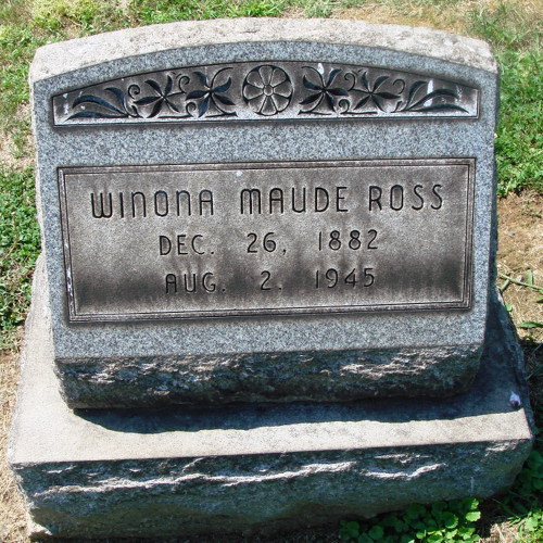 Winona Maud Cousins was born on 26 December 1882 at Pine Township, Armstrong, Pennsylvania.1,3,4 She married William Howard Ross on 23 March 1904 at Allegheny, Pennsylvania.2,5,6 Winona Maud Cousins died on 2 August 1945 at age 62.3 She was buried on 5 August 1945 at Union Cemetery, Arnold, Westmoreland, Pennsylvania.3 Winona Maud Cousins Find-a-Grave.com ID # 97090746.