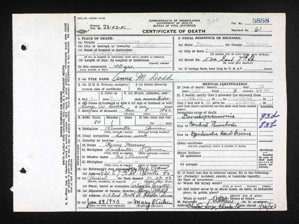 - [S32] Death Certificate, Pennsylvania Death Certificates 1906-1963. Certificate # 100042.