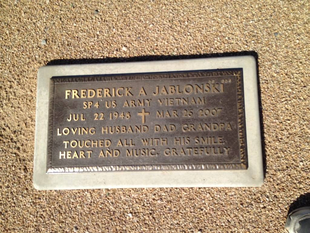 Frederick A Jablonski was born on 22 July 1948.1 He married Cynthia Jo Anderson, daughter of William Arthur Anderson and Gaylene Ann McAfoose, after 1993. Frederick A Jablonski died on 26 March 2007 at VA Hospital, Prescott, Arizona, at age 58.3,2 He was buried on 9 April 2007 at National Memorial Cemetery of Arizona, Cave Creek, Phoenix, Arizona. National Memorial Cemetery of Arizona