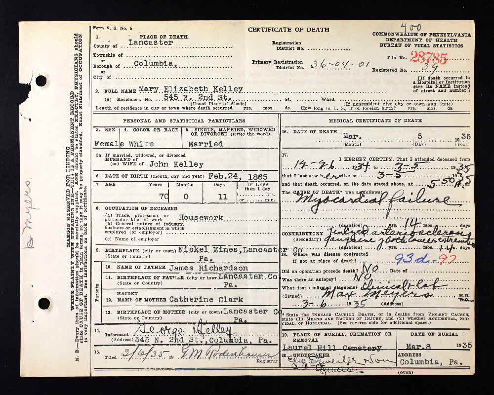 - [S32] Death Certificate, Pennsylvania, Death Certificates, 1906-1964 for Mary Elizabeth Kelley # 28785.