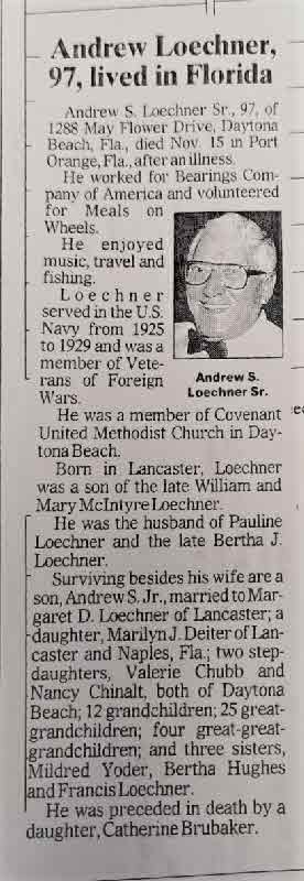 Andrew Loechner was born on 2 March 1904 at Lancaster, Pennsylvania.1,2 He married Pauline Clifton, daughter of Arthur Clifton and Annie Botton, after 1979.1 Andrew Loechner died on 15 November 2001 at Daytona Beach, Volusia, Florida, at age 97.3,2,4 He was buried on 18 November 2001 at Conestoga Memorial Park, Lancaster, Lancaster, Pennsylvania, evidently returned to Lancaster County and was buried with his first wife, Bertha Smith who died in 1979.2 Andrew Loechner Find-a-Grave.com ID # 188652427.5