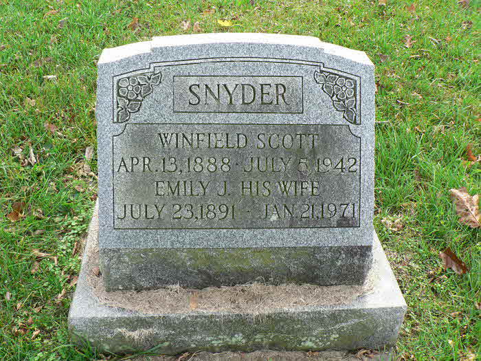Winfield Scott Snyder was born on 13 April 1888 at Columbia, Lancaster, Pennsylvania.1,2 He married Emily J. Collier.1 Winfield Scott Snyder died on 5 July 1942 at Columbia, Lancaster, Pennsylvania, at age 54.2 He was buried on 8 July 1942 at Laurel Hill Memorial Gardens, Columbia, Lancaster, Pennsylvania.2 Winfield Scott Snyder Find-a-Grave.com ID # 64366993 & obituary.