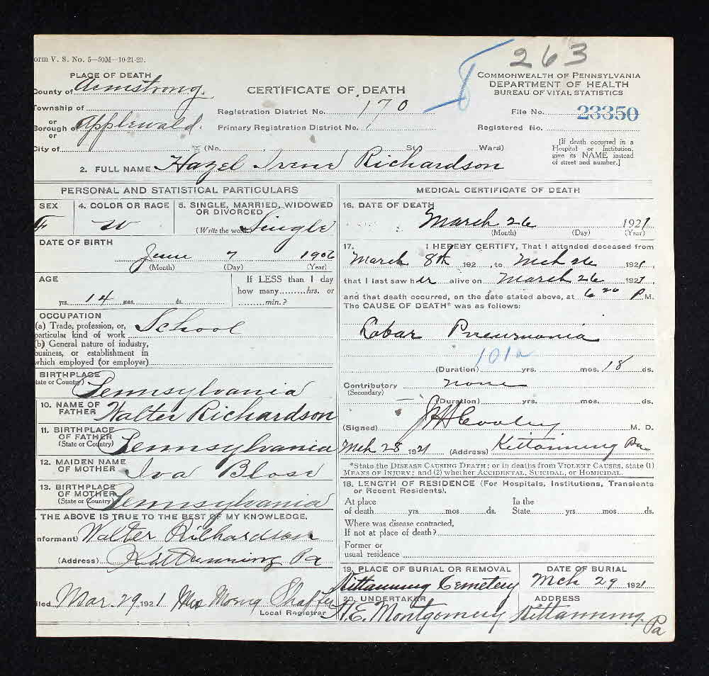 Hazel Irene Richardson was born on 7 June 1906 at Pennsylvania.1,3 She died on 26 March 1921 at Applewald, Armstrong, Pennsylvania, at age 14.3 She was buried on 29 March 1921 at Kittanning Cemetery, Kittanning, Armstrong, Pennsylvania.3 Hazel Irene Richardson Find-a-Grave.com ID # 101865086.
