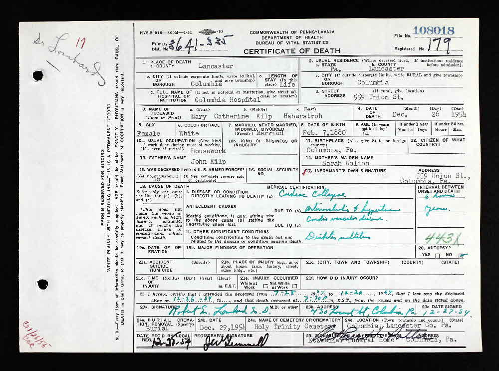 Mary Catherine Kilp was born on 7 February 1880 at Columbia, Lancaster, Pennsylvania.1,3 She married Albert Haberstroh, son of Amand Haberstroh and Anna Gruelich, on 22 February 1900 at Lancaster, Lancaster, Pennsylvania.1,6 Mary Catherine Kilp died on 26 December 1954 at Columbia Hospital, Columbia, Lancaster, Pennsylvania, at age 74. Cause of death was Cardiac Collapse complicated by diabetis.3 She was buried on 29 December 1954 at Holy Trinity Cemetery, Columbia, Lancaster, Pennsylvania.3