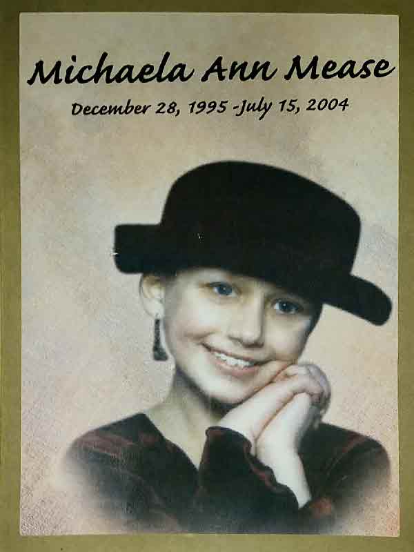 Michaela Mease was born on 28 December 1995. She died on 15 July 2004 at Lancaster, Lancaster, Pennsylvania, at age 8.1