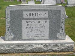 Enos Groff Kreider was born on 16 February 1875 at Leacock Township, Lancaster, Pennsylvania.1,3,2 He married Mary Frantz, daughter of Joseph Frantz Jr and Elizabeth B High, in 1907.4,5 Enos Groff Kreider died on 11 January 1946 at age 70.1,2 He was buried on 14 January 1946 at Paradise Mennonite Cemetery, Paradise, Lancaster, Pennsylvania.1 Enos Groff Kreider Find-a-Grave.com ID # 53724523.1