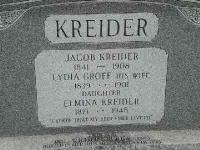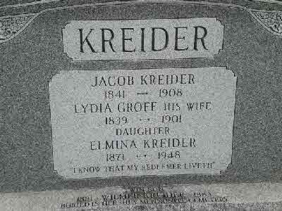Jacob Buckwalter Kreider was born on 13 February 1841 at Strasburg, Lancaster, Pennsylvania.1,4,5,2 He married Lydia Hershey Groff, daughter of Samuel Frantz Groff and Lydia Frantz Hershey, on 4 December 1866.1,4,2 Jacob Buckwalter Kreider died on 20 July 1908 at at home, Gordonville, Lancaster, Pennsylvania, at age 67.1 He was buried on 23 July 1908 at Paradise Mennonite Cemetery, Paradise, Lancaster, Pennsylvania.1 Jacob Buckwalter Kreider Find-a-Grave.com ID # 35457089 & full obituary.1