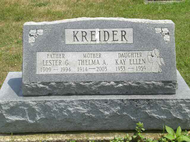 Kay Ellen Kreider was born on 11 June 1953 at Lancaster, Pennsylvania.2,3 She died on 30 July 1959 at St Joseph Hospital, Lancaster, Lancaster, Pennsylvania, at age 6. Cause of death was traumatic death and shock caused by being struck by auto in Salisbury Township on highway.1,2,3 She was buried on 2 August 1959 at Paradise Mennonite Cemetery, Paradise, Lancaster, Pennsylvania.4,3 Kay Ellen Kreider Find-a-Grave.com ID # 55035079.2