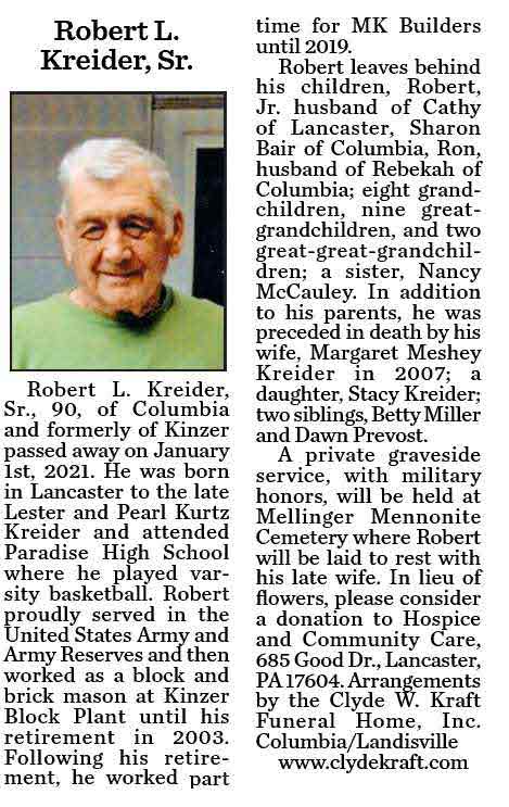 Robert Leroy Kreider married Margaret Meshey.2 Robert Leroy Kreider was born on 14 October 1930.3 He died on 1 January 2021 at age 90.2 He was buried on 13 January 2021 at Mellinger Mennonite Cemetery, Lancaster, Lancaster, Pennsylvania.2