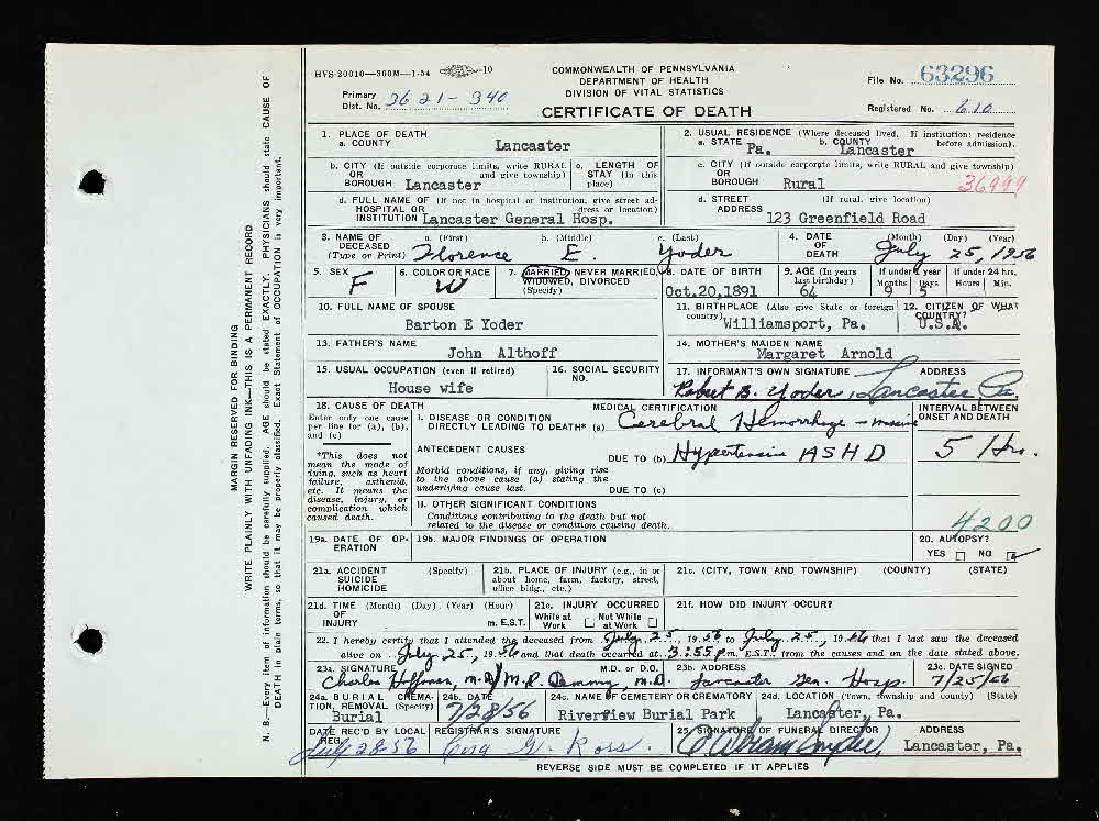 - [S32] Death Certificate, Pennsylvania, Death Certificates, 1906-1964 for Florence E Yoder # 63296.