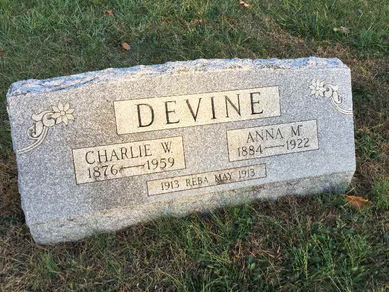 Anna M Bills was born on 17 July 1884 at Lancaster, Pennsylvania.1,2 She married Charles W Devine before 1913.3 Anna M Devine died on 30 January 1922 at Honey Brook, Chester, Pennsylvania, at age 37. Cause of death was cancer of uterus.2 She was buried on 3 February 1922 at Mount Zion United Methodist Cemetery, Narvon, Lancaster, Pennsylvania.2 Anna M Bills Find-a-Grave.com ID # 30515379.