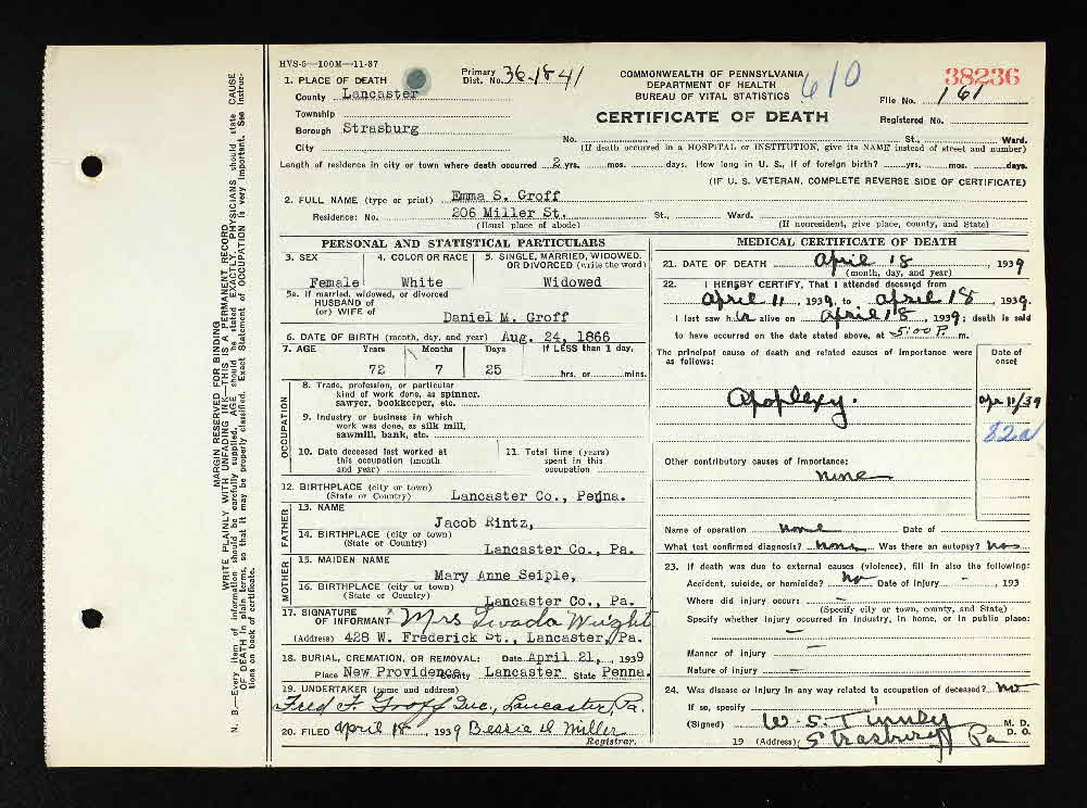 - [S32] Death Certificate, Pennsylvania Death Certificates 1906-1963. Certificate #38236 for his wife Emma Rintz Groff.