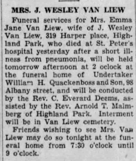 ? She appeared on the census of 1 August 1860 at Franklin Township, Somerset, New Jersey.1 She witnessed She began receiving pension for her father's service on this date and would continue receipt until her 16th birthday, May 20 1874. Her pension was $2. per month. on 6 May 1864.3 She witnessed Sarah requested an increase of her pension from $8. to $14. on this document on 14 September 1866.7 She lived on 14 September 1866 at South Brunswick, Middlesex, New Jersey.7 She was listed as a resident in Sarah E Hughes's household in the census report on 24 July 1870 at New Brunswick, Middlesex, New Jersey; Living in same building as William Mererole, a fruit dealer and his family, wife and 7 children.8 Emma J Hughes appeared on the census of 6 June 1880 at Drift Street, New Brunswick, Middlesex, New Jersey.9 As of 21 June 1890,her married name was Van Liew.4 She was listed as a resident in John Wesley Van Liew and Emma J Van Liew's household in the census report on 12 June 1900 at 337 Townsend St, New Brunswick, Middlesex, New Jersey.10 She was listed as a resident in John Wesley Van Liew and Emma J Van Liew's household in the census report on 22 April 1910 at 337 Tounsend St, New Brunswick, Middlesex, New Jersey; Census states Emma was mother of 2 children, both living at time of census. Family owned their home.11 She was included Helen E Brown sold to Emma J Van Liew, property on Drift St, New Brunswick. on 14 December 1924 at 12 Drift St, New Brunswick, Middlesex, New Jersey.12 She was listed as a resident in John Wesley Van Liew and Emma J Van Liew's household in the census report on 7 April 1930 at 337 Tounsend St, New Brunswick, Middlesex, New Jersey.13