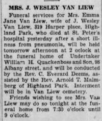 Emma J Hughes was born on 21 May 1858 at New Brunswick, New Jersey, Helen Wines witnessed birth of Emma Hughes & Charles Hughes. Also witnessed was Elizabeth Rowland.1,2,3 She married John Wesley Van Liew on 21 June 1890 at New Brunswick, Middlesex, New Jersey.4 Emma J Van Liew died on 3 January 1940 at St Peter's Hospital, New Brunswick, Middlesex, New Jersey, at age 81. Cause of death was pneumonia.5,6 She was buried on 5 January 1940 at Van Liew Cemetery, North Brunswick, Middlesex, New Jersey.5,6 Emma J Hughes Find-a-Grave.com ID # 81927910.
