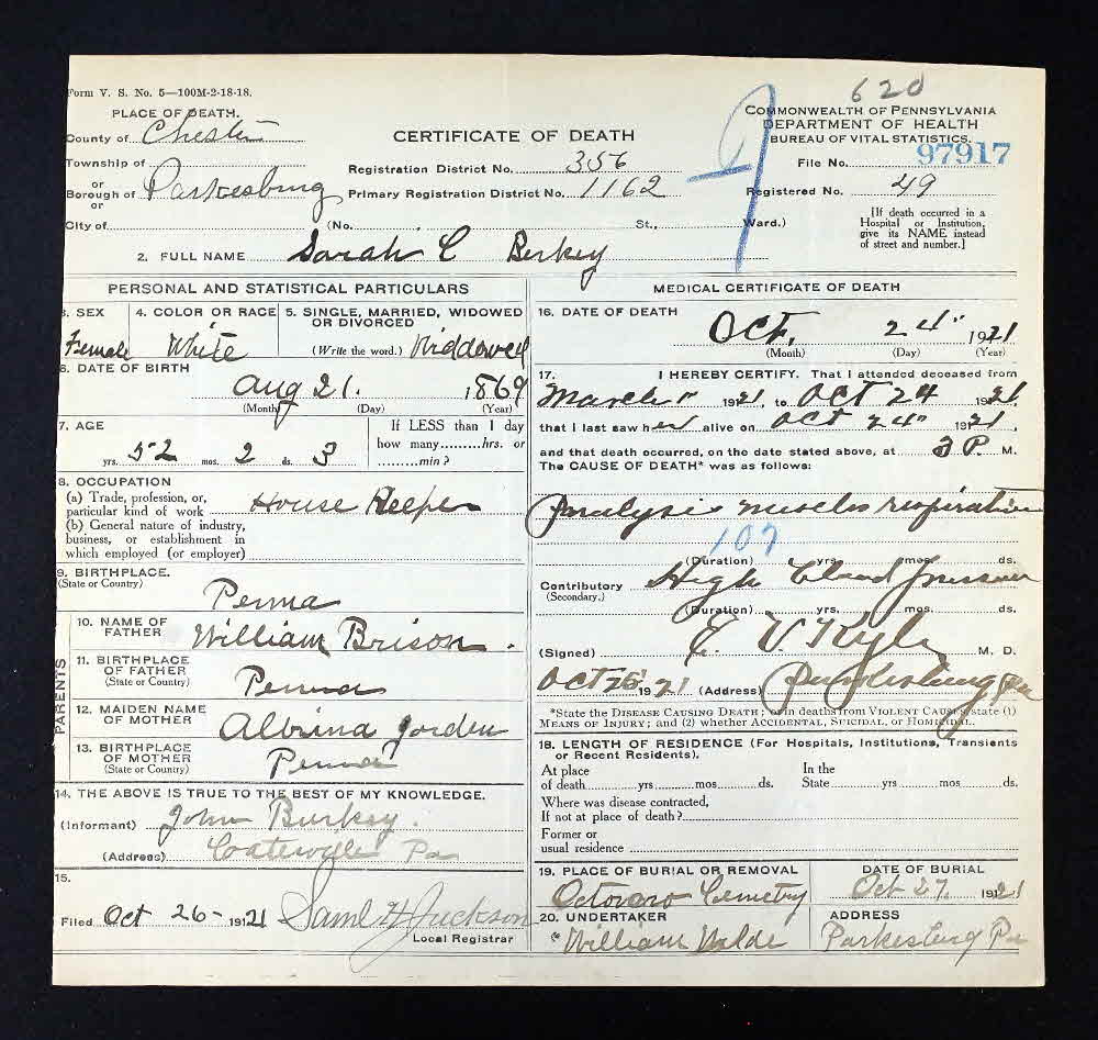 - [S32] Death Certificate, Pennsylvania, Death Certificate 1906-1968 for Sarah C Berkey.