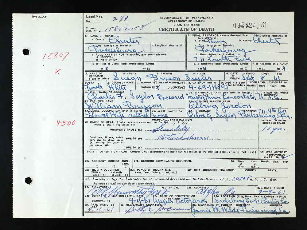 - [S32] Death Certificate, Pennsylvania Death Certificates for Susan Bryson Sayler # 082524=61.