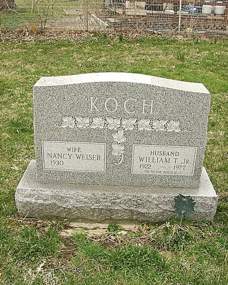 William T Koch Jr was buried at Strasburg Cemetery, Strasburg, Lancaster, Pennsylvania. He was born on 31 October 1922 at Strasburg, Pennsylvania.1 He married Nancy Weiser, daughter of Robert C Weiser and Anna Boyd, on 4 April 1948. William T Koch Jr died on 8 December 1977 at Strasburg, Pennsylvania, at age 55. He was buried on 11 December 1977 at Strasburg Cemetery, Strasburg, Lancaster, Pennsylvania.2