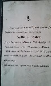 Sarah (Sallie) Fly was buried at with husband Lot 81 Section E. She was born on 15 November 1844. She married George Washington Jester, son of Levis James Jester and Eliza Border, on 6 May 1869 at Rev Joseph W Porter in Phoenixville, Phoenixville, Pennsylvania. Sarah (Sallie) Fly died on 27 February 1899 at Phoenixville, Pennsylvania, at age 54.