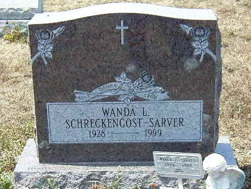 Wanda Lorraine Howard was born on 4 January 1928 at Armstrong, Pennsylvania.3 She married Donald Franklin Schreckengost on 23 March 1948.2,3 Wanda Lorraine Schreckengost married Dale Frederick Sarver on 1 February 1975.2,3 Wanda Lorraine Sarver died on 16 March 1999 at Freeport, Armstrong, Pennsylvania, at age 71.2 She was buried on 19 March 1999 at Brookland Cemetery, Bagdad, Westmoreland, Pennsylvania.2 Wanda Lorraine Sarver Find-a-Grave.com ID # 70227043 + family links.