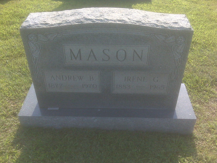 Andrew B Mason was born in 1877.1 He married Irene G (?)1 Andrew B Mason died in 1970.1 He was buried in 1970 at Wilderness Baptist Cemetery, Wilderness Corner, Spotsylvania, Virginia.1 Andrew B Mason Find-a-Grave.com ID # 15581076.