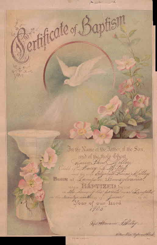 ? She appeared on the census of 6 June 1900 at Paradise Township, Lancaster, Pennsylvania.6 As of 16 February 1910,her married name was Crossen.3 She lived on 19 February 1910 at Paradise, Lancaster, Pennsylvania.3 She appeared on the census of 21 April 1910 at Paradise Twp., Lancaster, Pennsylvania.7 A note I copied at St James church on April 26, 1989 states Entries for Grace Episcopal Church at Nickel Mines are entered in Book 3-8172, vol 4. These volumes have been copied and are currently found at Lancaster Historical Society, Lancaster, PA. Grace Episcopal is the original name of this church and cemetery.