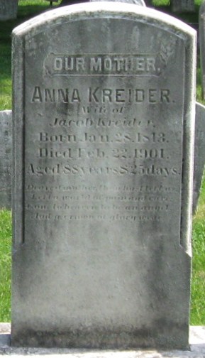 Anna Buckwalter Kreider was born on 5 November 1839 at Leacock Township, Lancaster, Pennsylvania.1,3,2,4 She married Jacob Eby Ranck before 1864.3 Anna Buckwalter Kreider died on 8 August 1931 at Lancaster, Pennsylvania, at age 91.2 She was buried on 11 August 1931 at Strasburg Mennonite Cemetery, Strasburg, Lancaster, Pennsylvania.2 Anna Buckwalter Kreider Find-a-Grave.com ID # 144008787.