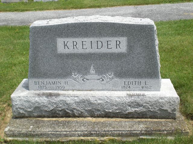Benjamin H Kreider was born on 29 January 1875 at Pennsylvania.1,2 He married Edith L Rutt, daughter of Jacob Rutt and Elizabeth Lichty, in 1896.1 Benjamin H Kreider died on 16 June 1950 at age 75.3,2 He was buried on 19 June 1950 at Paradise Mennonite Cemetery, Paradise, Lancaster, Pennsylvania.3 Benjamin H Kreider Find-a-Grave.com ID # 36437067.