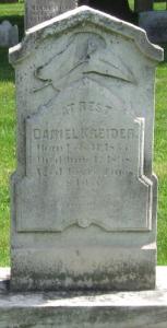 Daniel Kreider was born on 11 February 1853 at Pennsylvania.1,2 He died on 12 June 1898 at age 45.2 He was buried on 15 June 1898 at Mellinger Mennonite Cemetery, Lancaster, Lancaster, Pennsylvania.2 Daniel Kreider Find-a-Grave.com ID # 35906448.