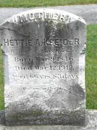 Esther Ann Hershey was born on 9 March 1846 at Pennsylvania.1,3 She married Tobias Kreider, son of Jacob Kreider and Anna Buckwalter, in 1868.1 Hettie Kreider died on 12 March 1912 at East Lampeter Township, Lancaster, Pennsylvania, at age 66. Cause of death was myocoritis.3,4 She was buried on 15 March 1912 at Paradise Mennonite Cemetery, Paradise, Lancaster, Pennsylvania.3 Esther Ann Hershey Find-a-Grave.com ID # 7480137.