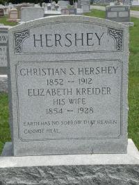 Elizabeth Kreider was born in 1854 at Pennsylvania.1 She married Christian S Hershey after 1870.2 Elizabeth Kreider died in 1928 at Pennsylvania.2 She was buried in 1928 at Paradise Mennonite Cemetery, Paradise, Lancaster, Pennsylvania.2 Elizabeth Kreider Find-a-Grave.com ID # 53725283.