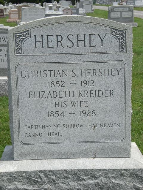 Christian S Hershey was born in August 1853.1 He married Elizabeth Kreider, daughter of Jacob Kreider and Anna Buckwalter, after 1870.1 Christian S Hershey died on 27 April 1912 at age 58.1 He was buried on 30 April 1912 at Paradise Mennonite Cemetery, Paradise, Lancaster, Pennsylvania.1 Christian S Hershey Find-a-Grave.com ID # 7480255.