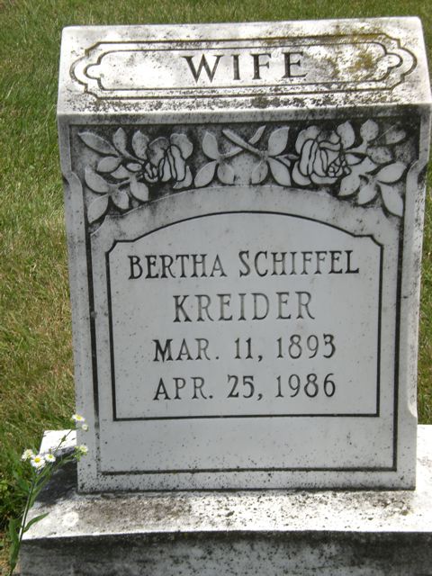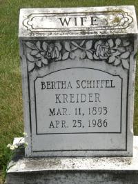 Bertha Schiffel was born on 11 March 1893.1 She married Harold Barton Kreider, son of Henry Kreider and Lillian Margaret Weiler, after 1917.1 Bertha Schiffel died on 25 April 1986 at age 93.1 She was buried on 28 April 1986 at Paradise Mennonite Cemetery, Paradise, Lancaster, Pennsylvania.1 Bertha Schiffel Find-a-Grave.com ID # 55044758.