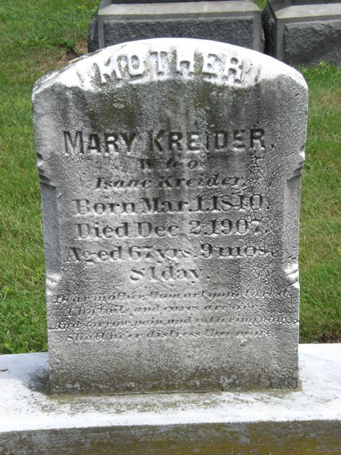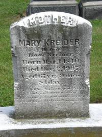 Mary Kreider and Isaac Kreider appeared on the census of 30 June 1900 at Leacock Township, Lancaster, Pennsylvania.At time of this census, Mary was mother of 6 children, only five living.3