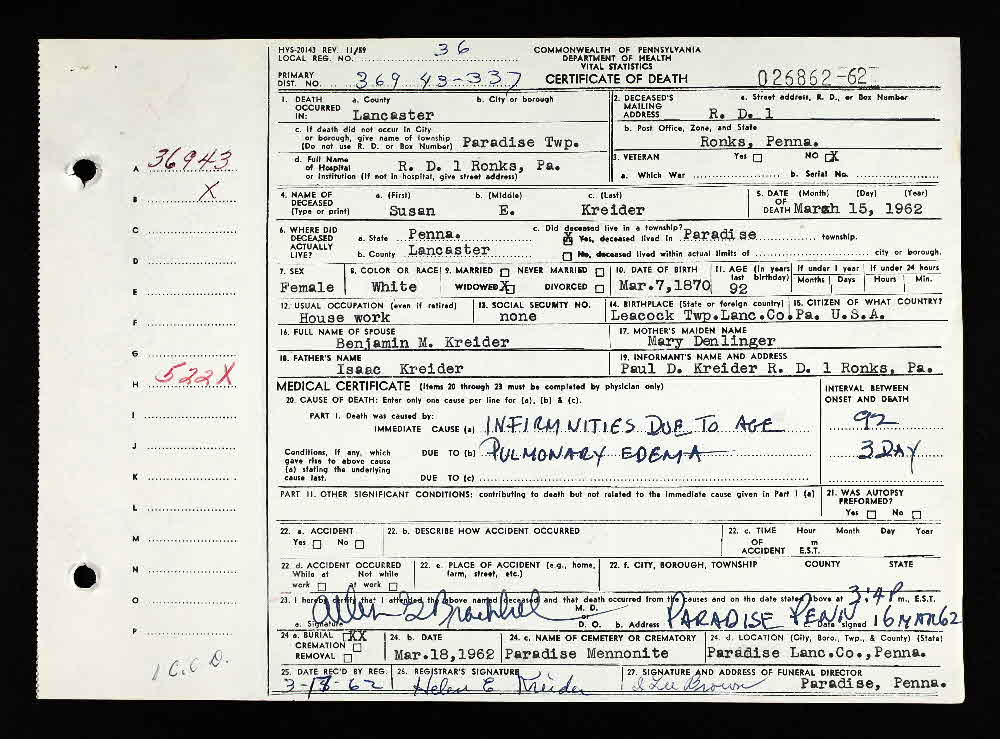 Susan Eva Kreider was born on 7 March 1870 at Leacock Township, Lancaster, Pennsylvania.1,3,4 She married Benjamin Mellinger Kreider, son of George Kreider and Anna Mellinger, before 1878.5 Susan Eva Kreider died on 15 March 1962 at At home, Paradise Township, Ronks, Lancaster, Pennsylvania, at age 92. Cause of death was infirmities due to age due to pulmonary edema.4 She was buried on 18 March 1962 at Paradiise Mennonite Cemetery, Paradise, Lancaster, Pennsylvania.4 Susan Eva Kreider Find-a-Grave.com ID # 35481199.