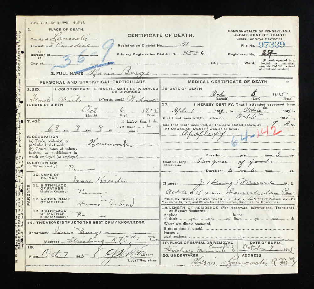 - [S32] Death Certificate, Pennsylvania Death Certificates 1906-1963 # 97339 for daughter Maria Barge.