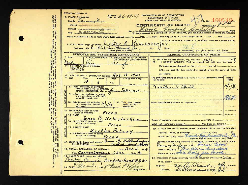 Lester Kellenberger was born on 19 August 1920.1,2 He died on 1 December 1938 at Leacock Township, Lancaster, Pennsylvania, at age 18; Cause of death was a fractured skull caused by tree falling while he was cutting firewood.2,3 He was buried on 4 December 1938 at Carpenters Cemetery, Lancaster, Lancaster, Pennsylvania.3